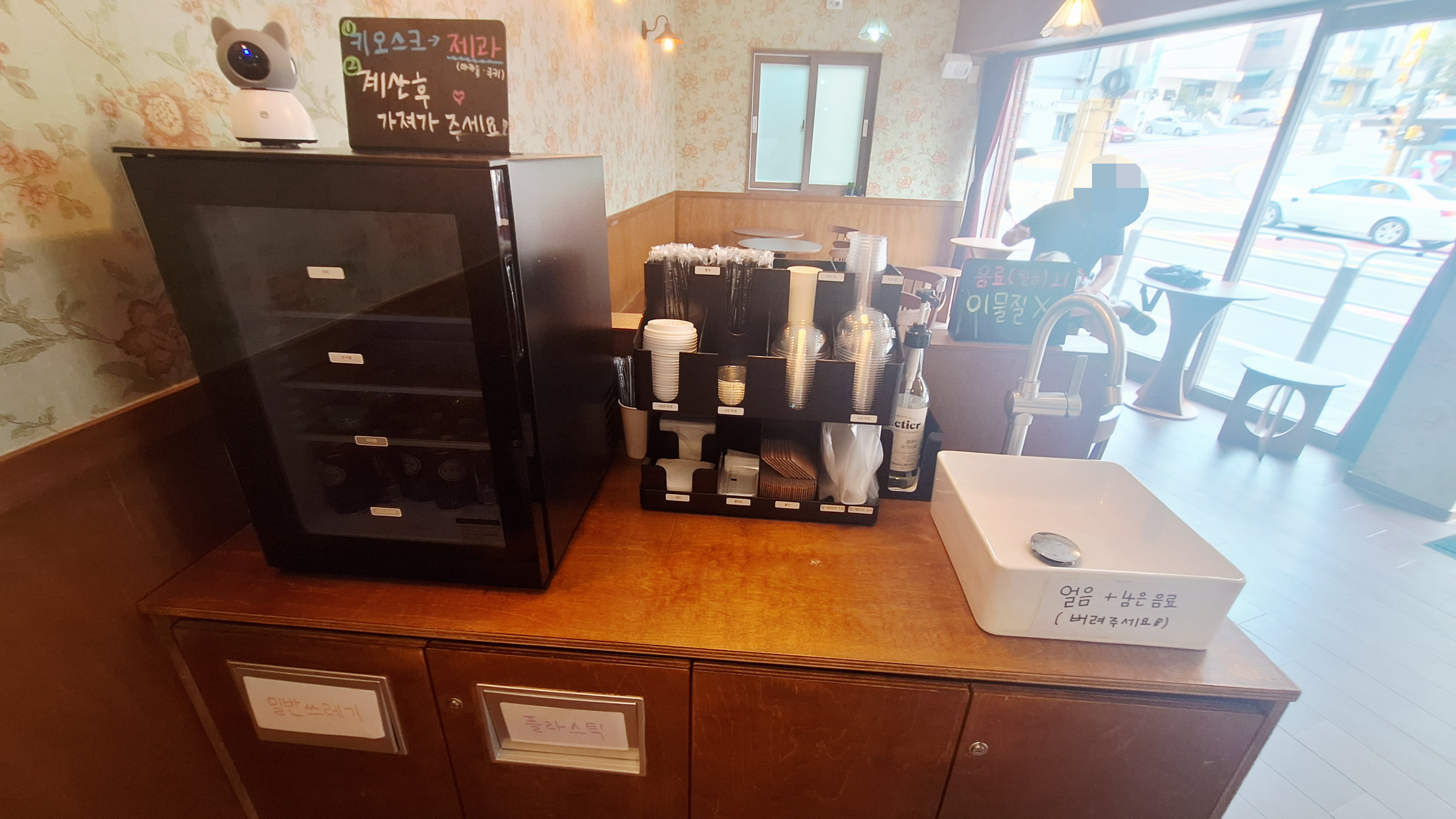 기계 뒷편으로 쇼케이스 냉장고와 싱크대 셀프바가 준비되어있다.